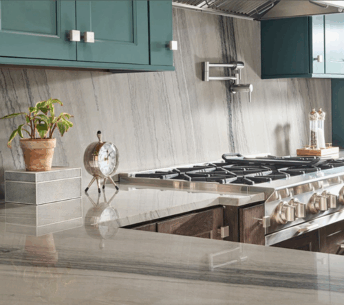Countertop with naturally occurring quartzite water marks along the edges, a normal feature that dissipates over time and is not damage.